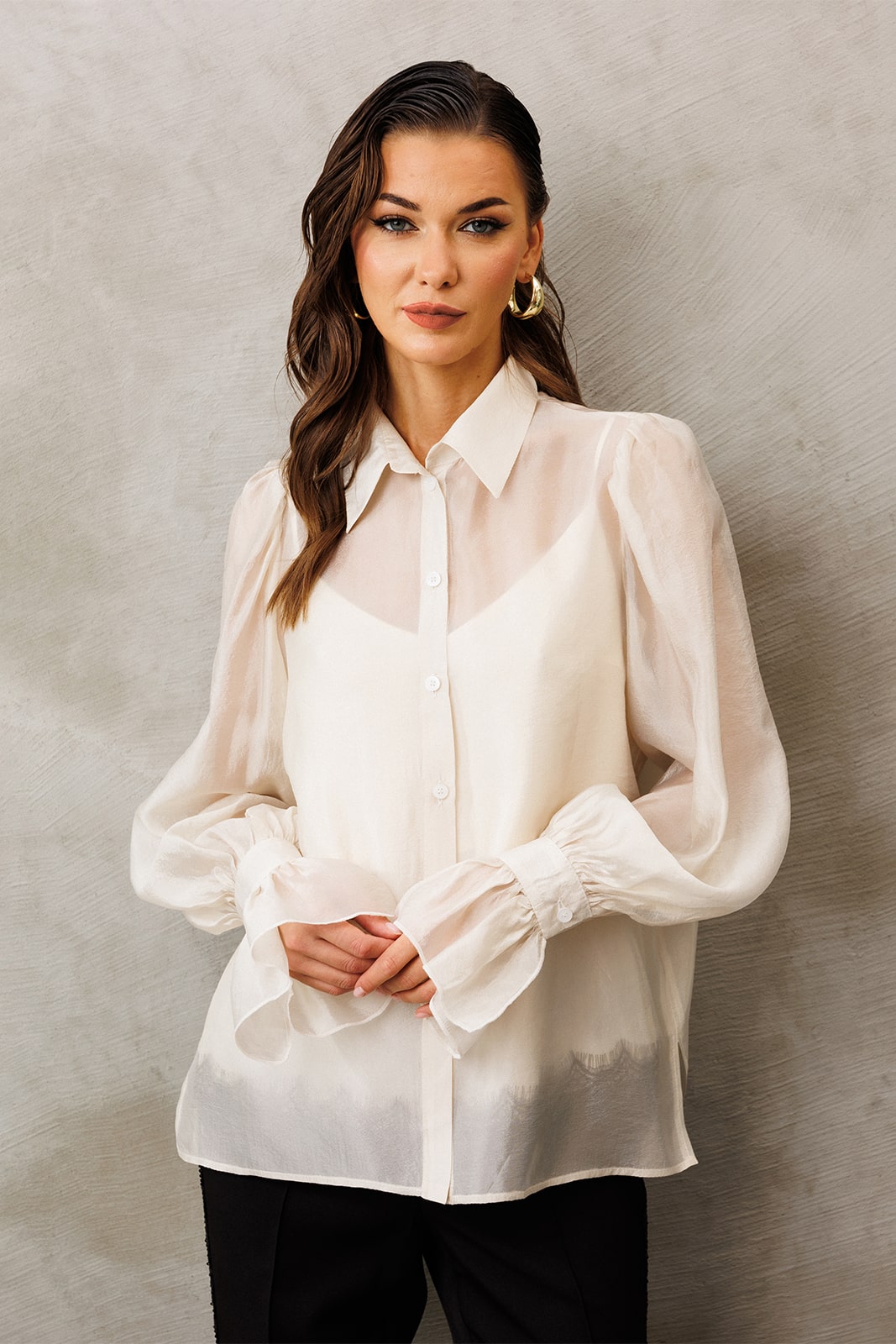 | Блузка из креп-шифона с напылением. Прямого силуэта, с втачным рукавом вверху со сборкой внизу на манжете с застежкой на петлю-пуговицу и рюшей на манжете. Полочка с центральной застежкой на петли-пуговицы на цельнокроеной планке. Воротник рубашечный отложной на стойке. Внизу по боковым швам обработаны разрезы. К блузке идет в комплект атласный топ на регулируемых бретелях прямого силуэта, на широкой обтачке. Полочка с V-образным вырезом и нагрудной вытачкой. |