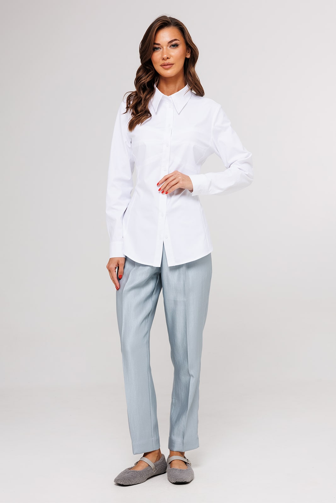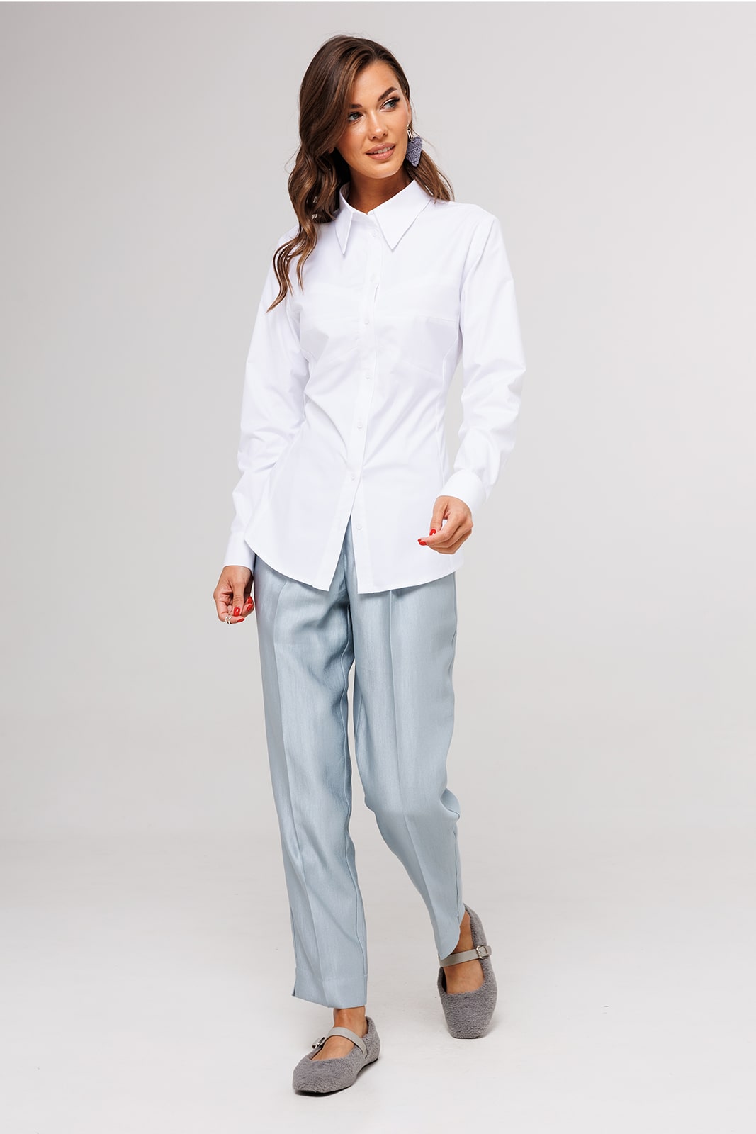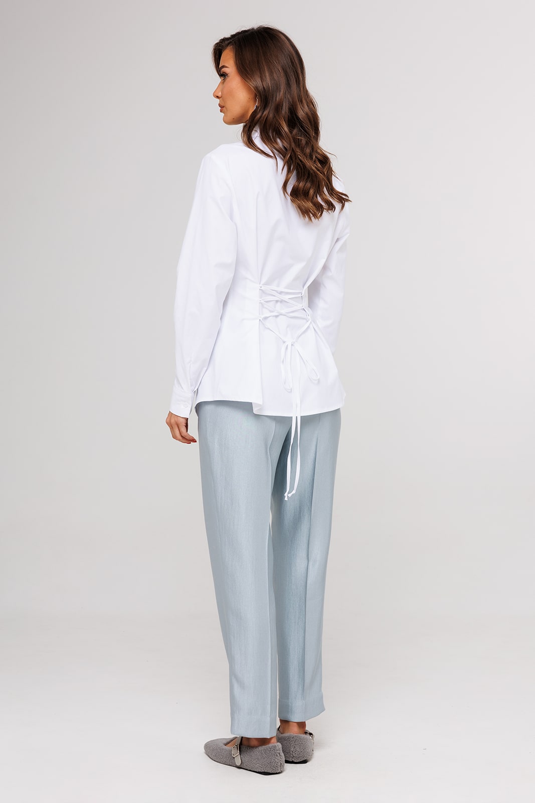 | Блузка полуприлегающего силуэта, с втачным одно шовным рукавом, со складкой и манжетой, с застежкой на петлю-пуговицу. Полочка с центральной застежкой на петли-пуговицы и с фигурными подрезами, имитирующими лиф. Спинка с рельефами и шнуровкой от рельефов. Воротник рубашечный отложной на стойке. Спинка и полочка с фигурным низом. |