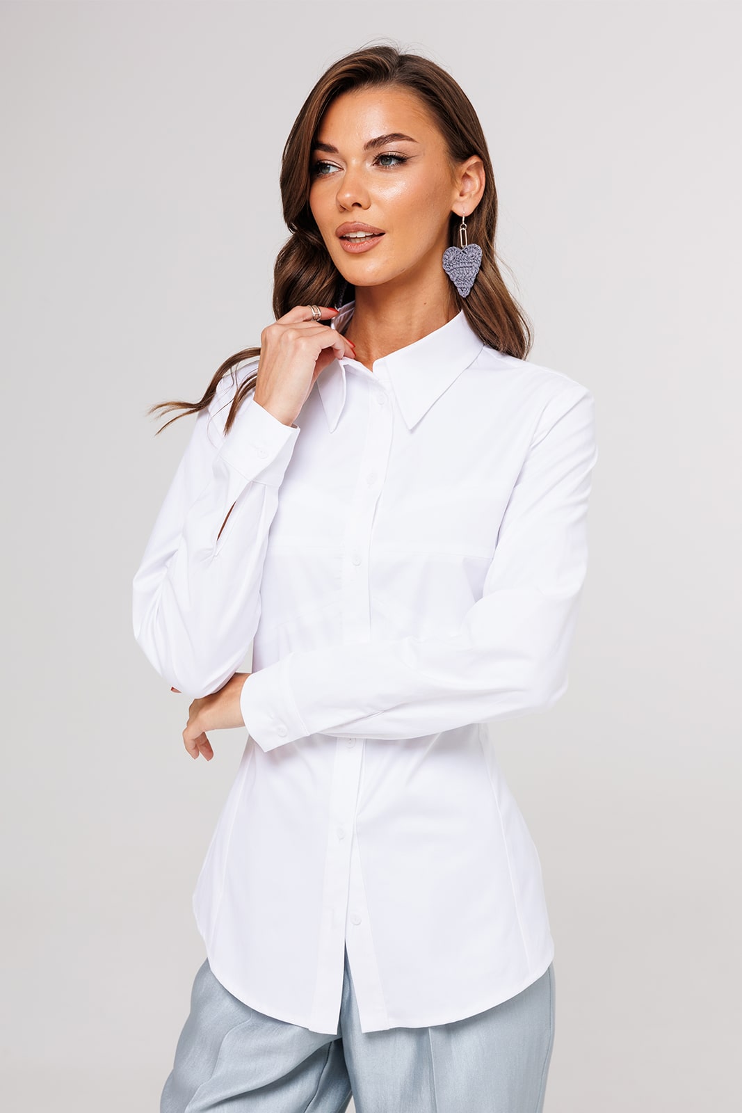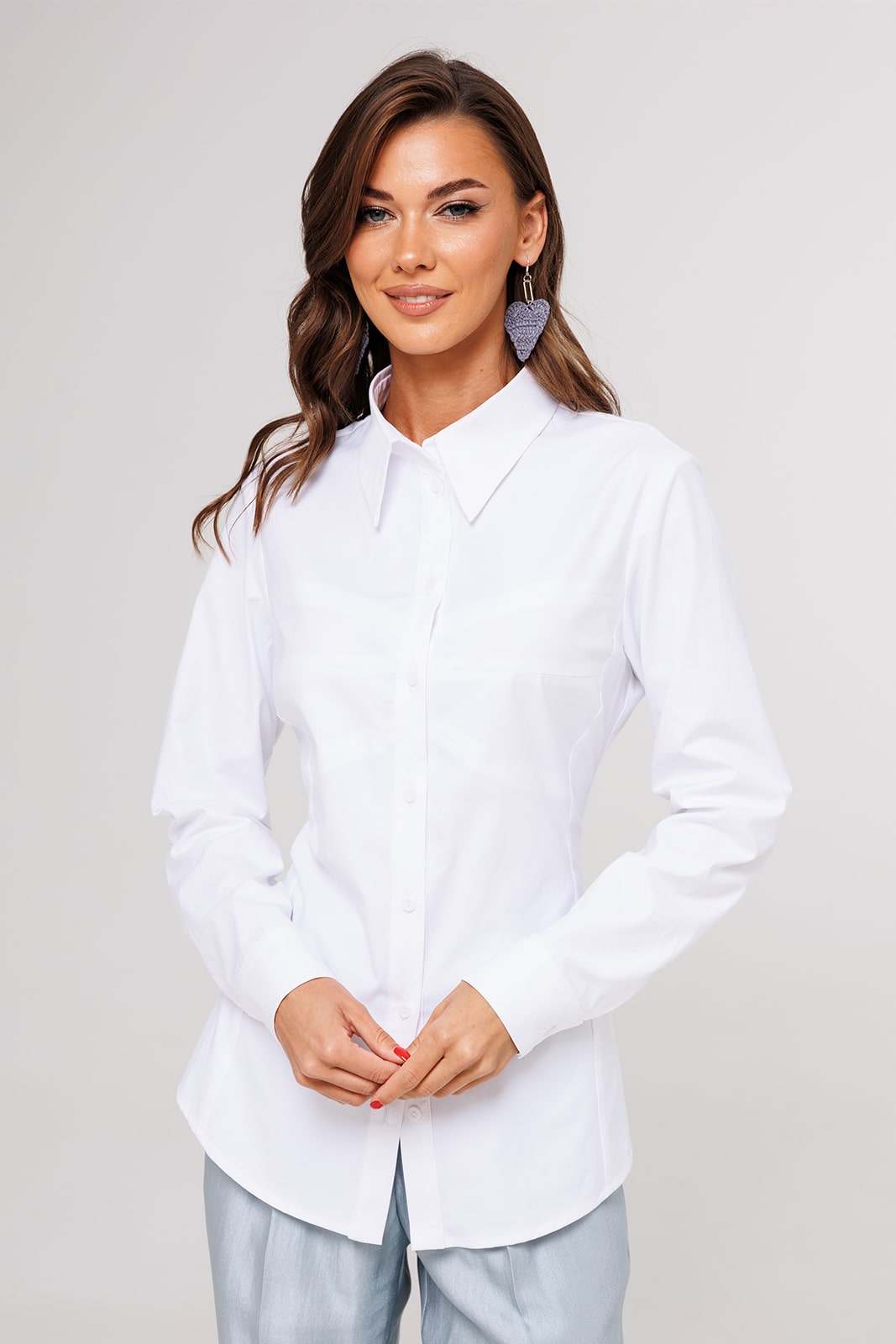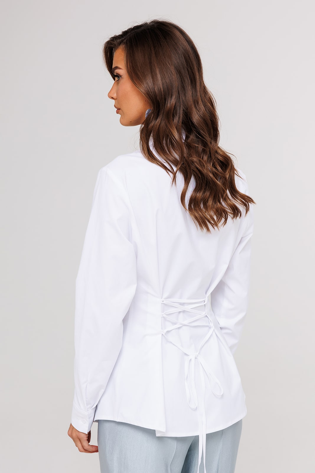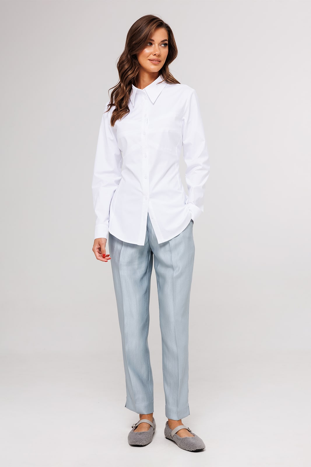 | Блузка полуприлегающего силуэта, с втачным одно шовным рукавом, со складкой и манжетой, с застежкой на петлю-пуговицу. Полочка с центральной застежкой на петли-пуговицы и с фигурными подрезами, имитирующими лиф. Спинка с рельефами и шнуровкой от рельефов. Воротник рубашечный отложной на стойке. Спинка и полочка с фигурным низом. |