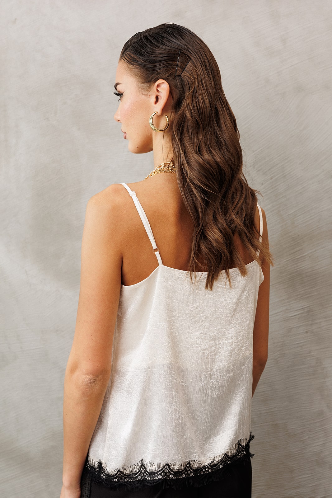| Атласная блузка-топ на регулируемых бретелях прямого силуэта, на широкой обтачке. Полочка с V-образным вырезом и нагрудной вытачкой. По низу блузки кружево. |
