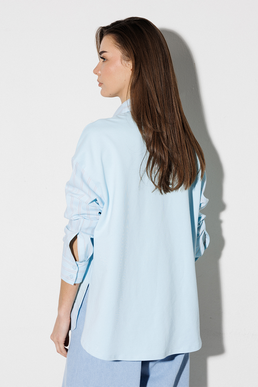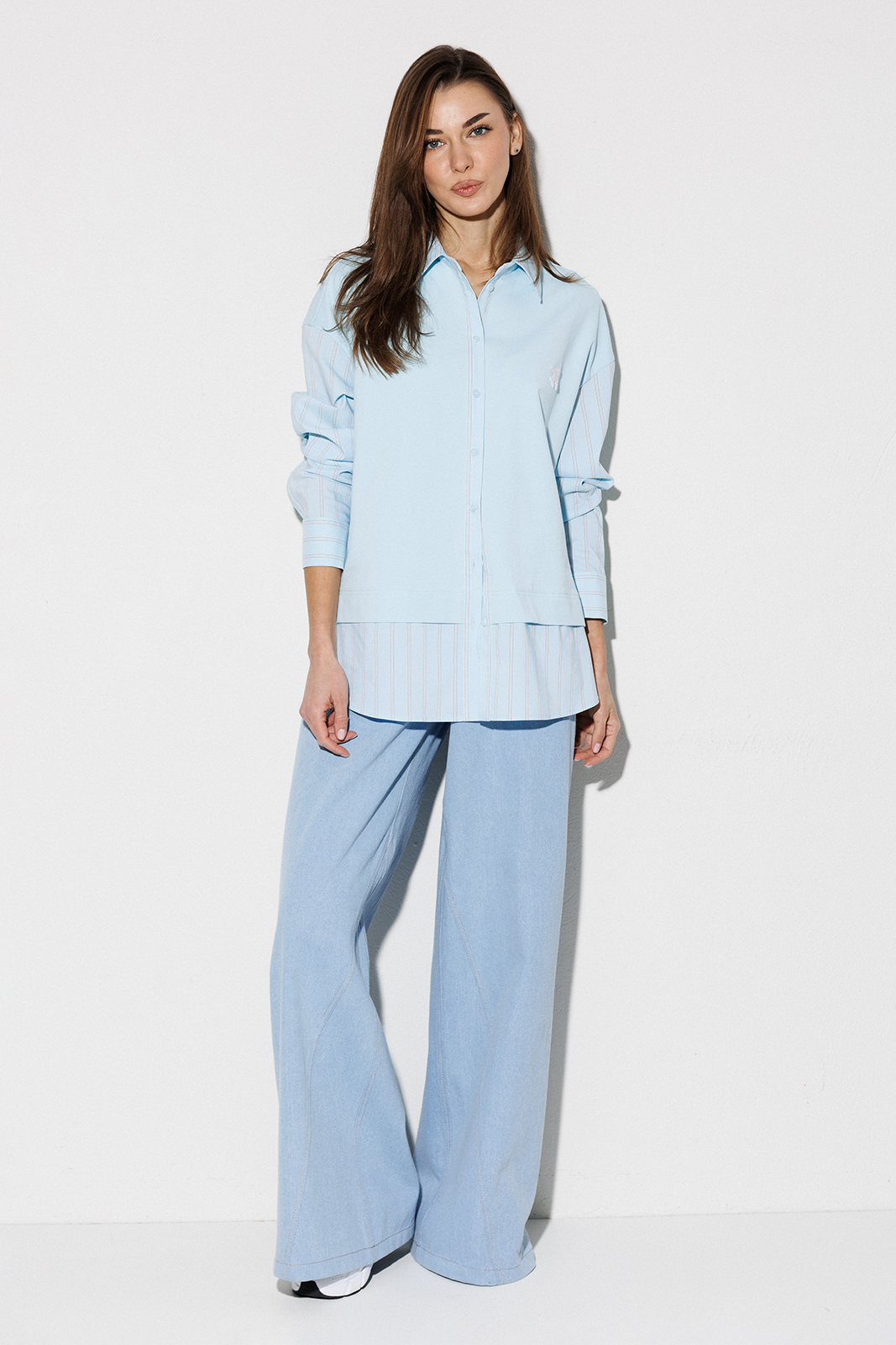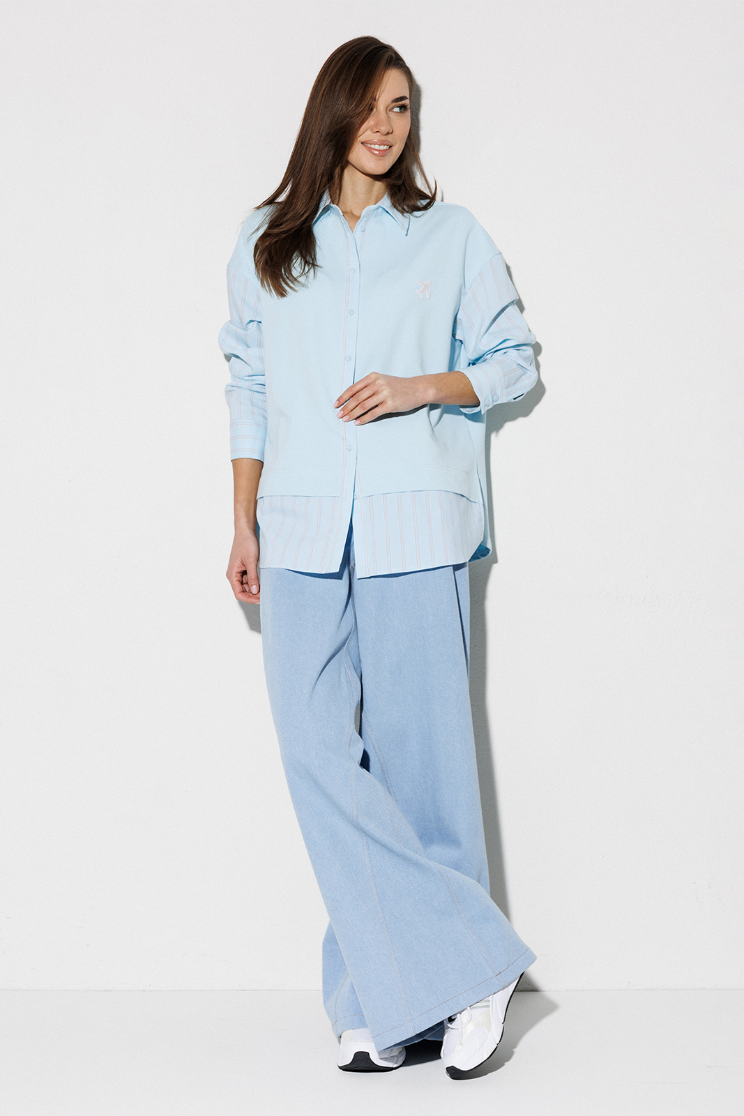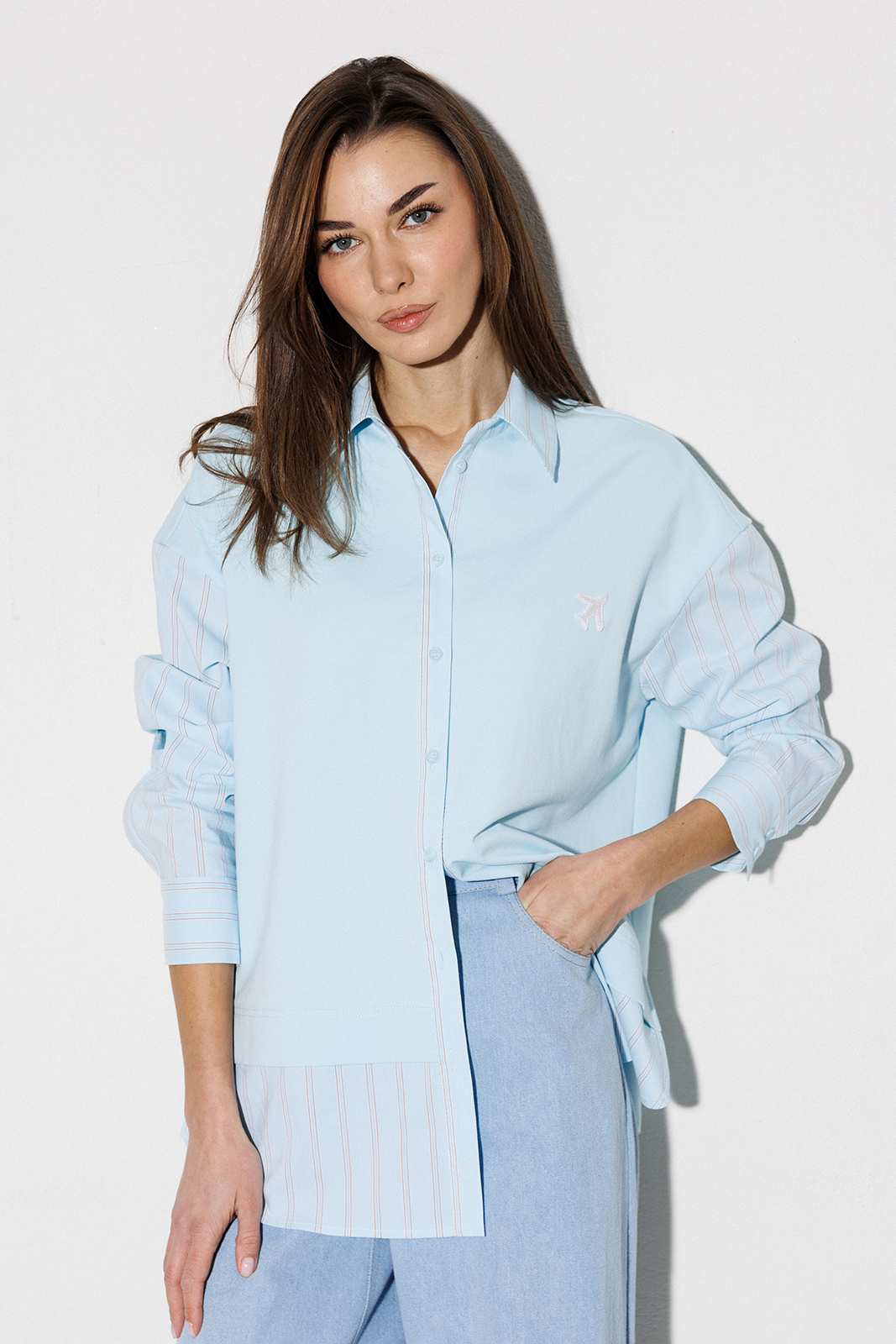 | Блузка, комбинированная прямого силуэта, с втачным одношовным рукавом, со складкой и манжетой, с застежкой на петли-пуговицы и спущенной линией плеча. Полочка из трикотажа и рубашечной ткани с центральной застежкой на петли-пуговицы и вышивкой «Самолет». Спинка из трикотажа с печатью «BUTER». Воротник рубашечный отложной на стойке. Спинка и полочка с фигурным низом. Внизу по боковым швам обработаны разрезы. |