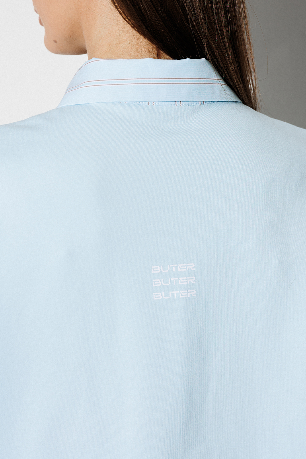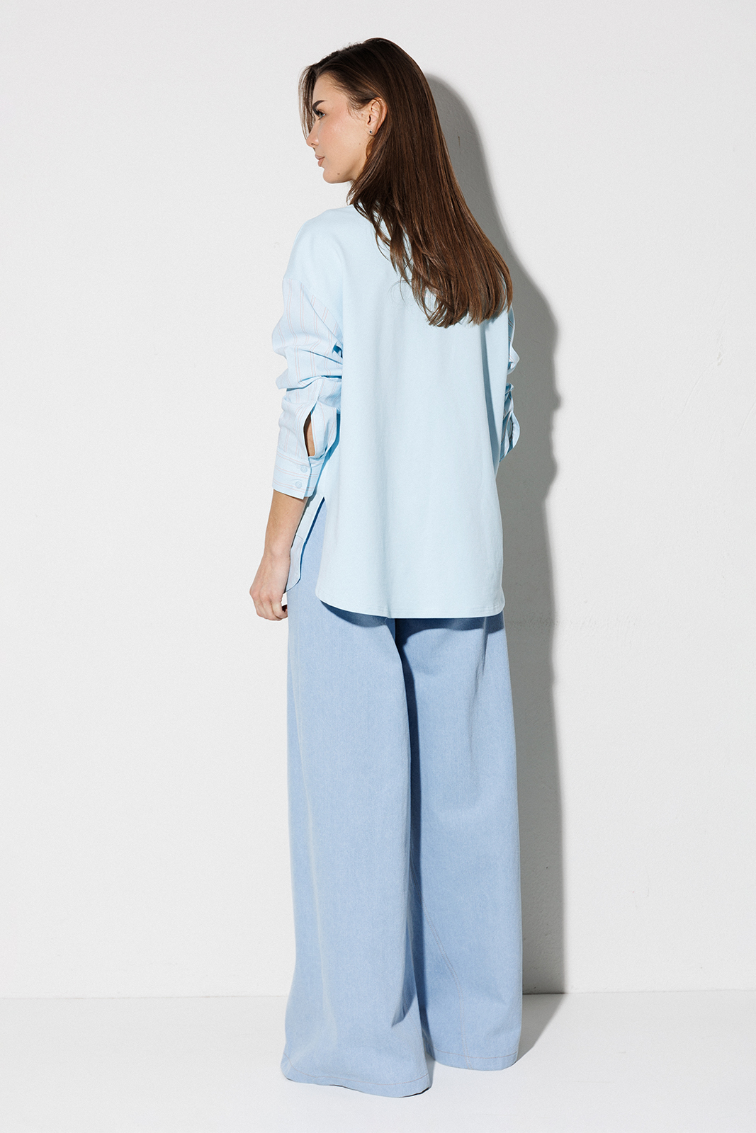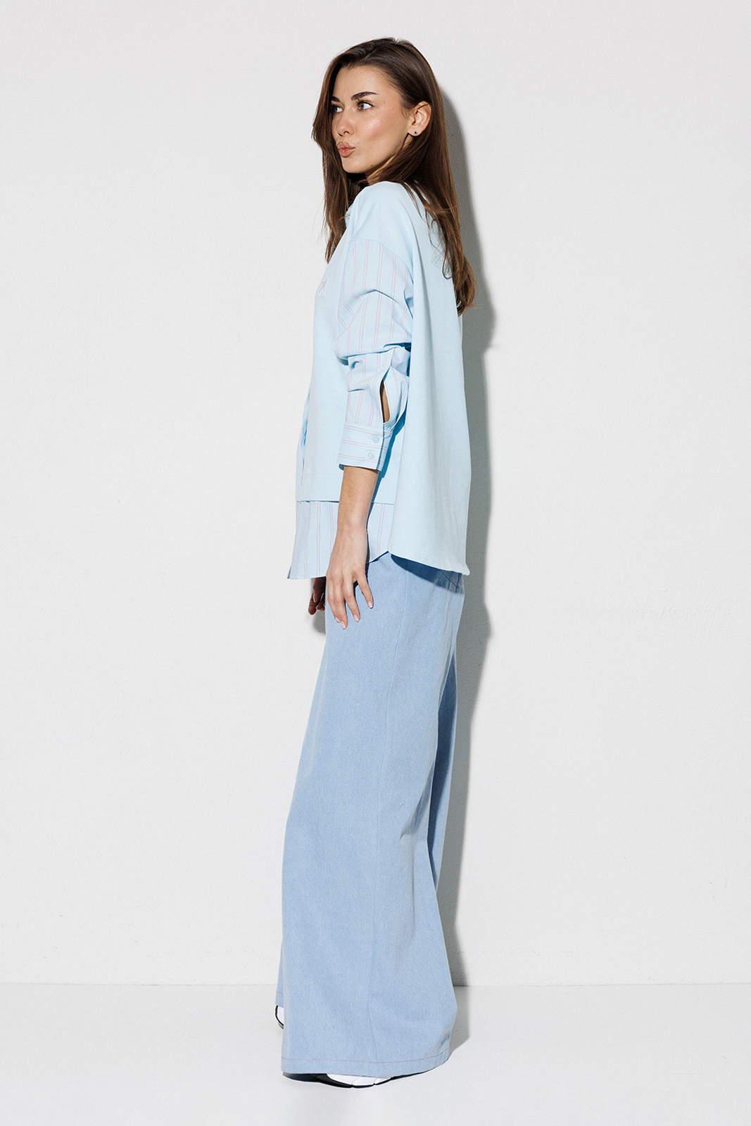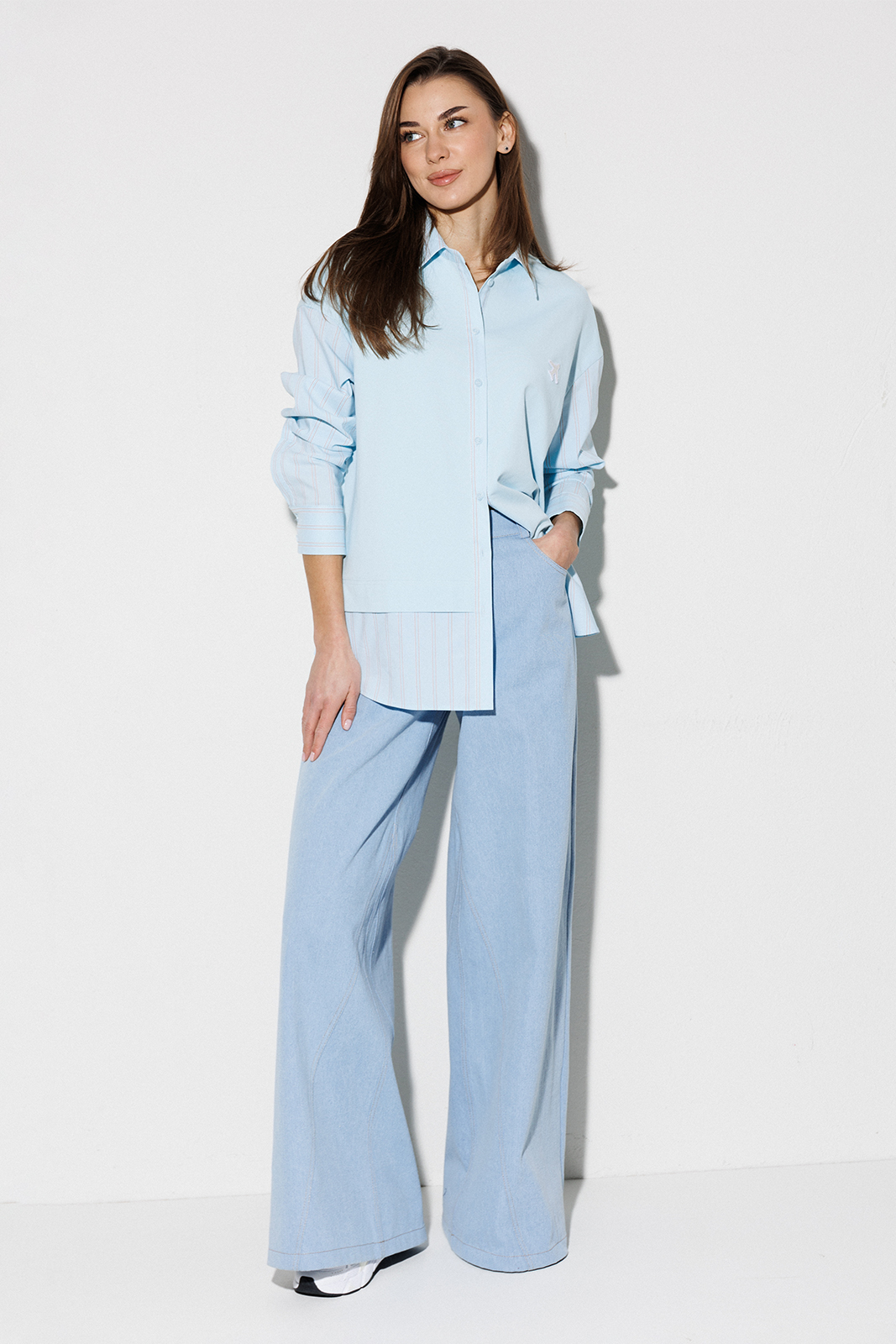 | Блузка, комбинированная прямого силуэта, с втачным одношовным рукавом, со складкой и манжетой, с застежкой на петли-пуговицы и спущенной линией плеча. Полочка из трикотажа и рубашечной ткани с центральной застежкой на петли-пуговицы и вышивкой «Самолет». Спинка из трикотажа с печатью «BUTER». Воротник рубашечный отложной на стойке. Спинка и полочка с фигурным низом. Внизу по боковым швам обработаны разрезы. |