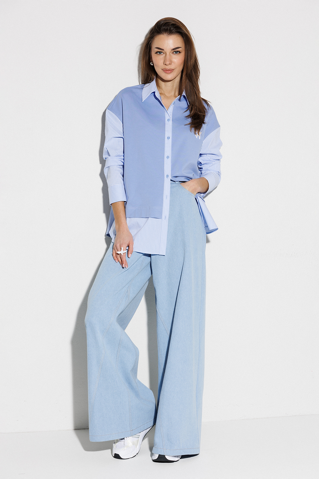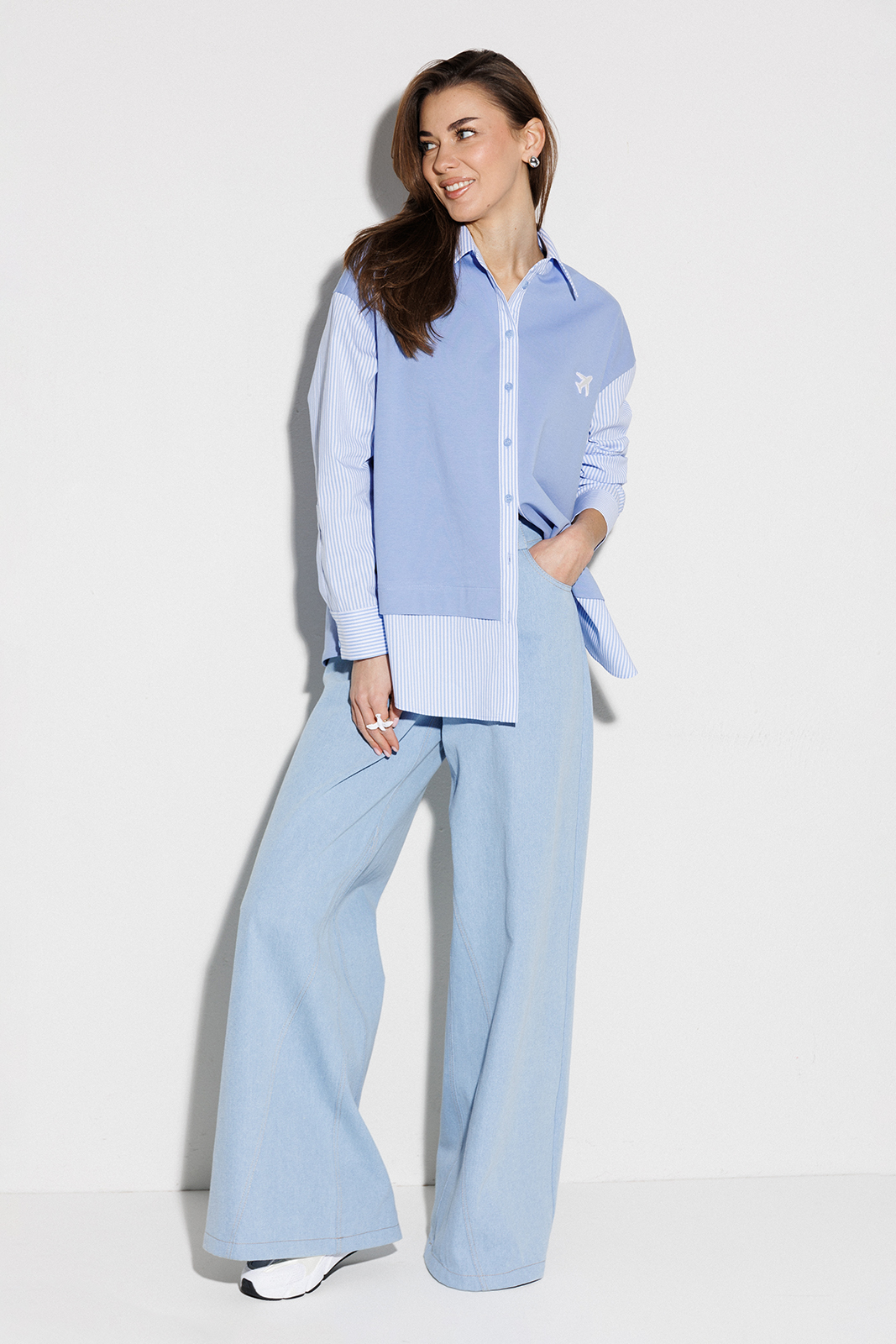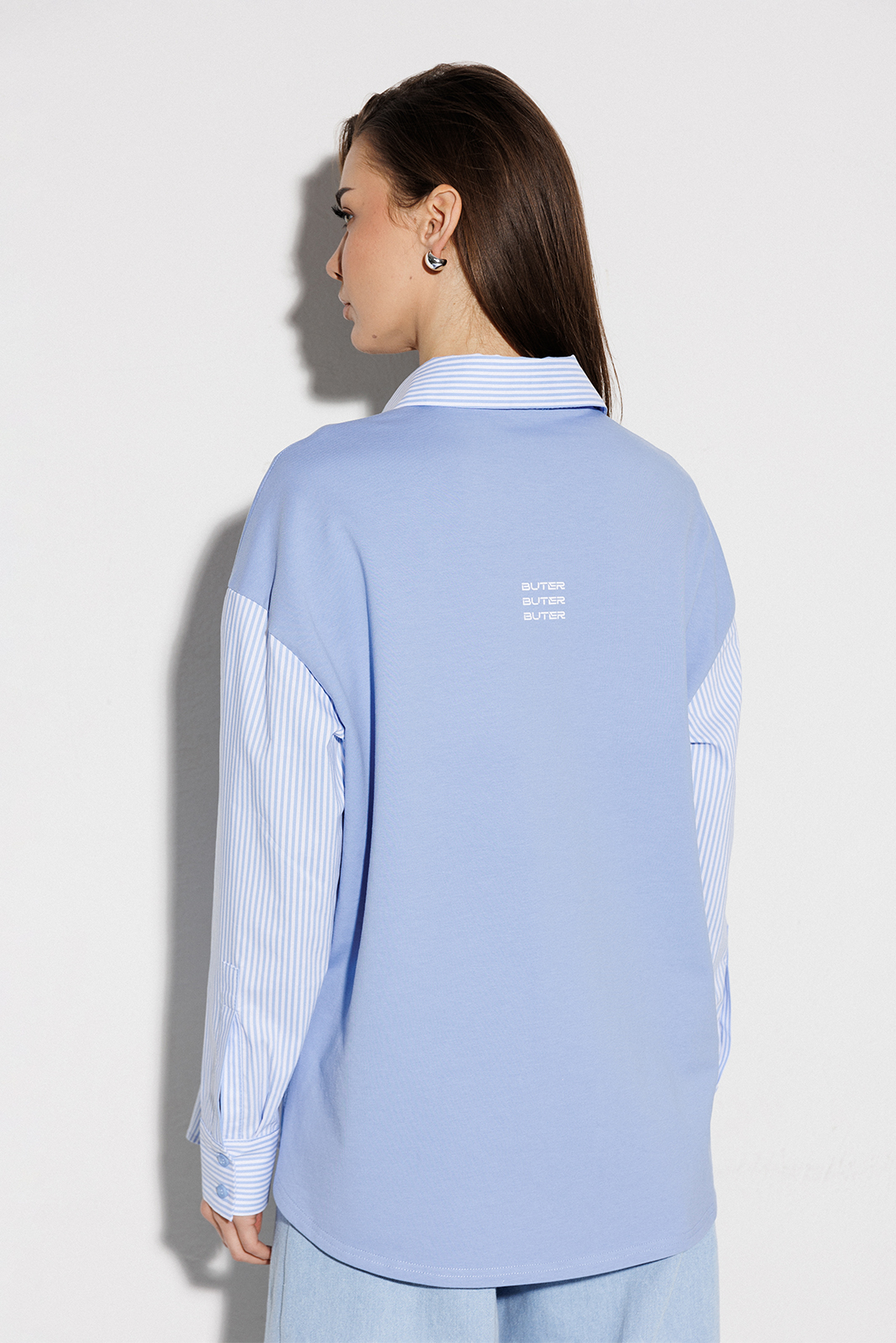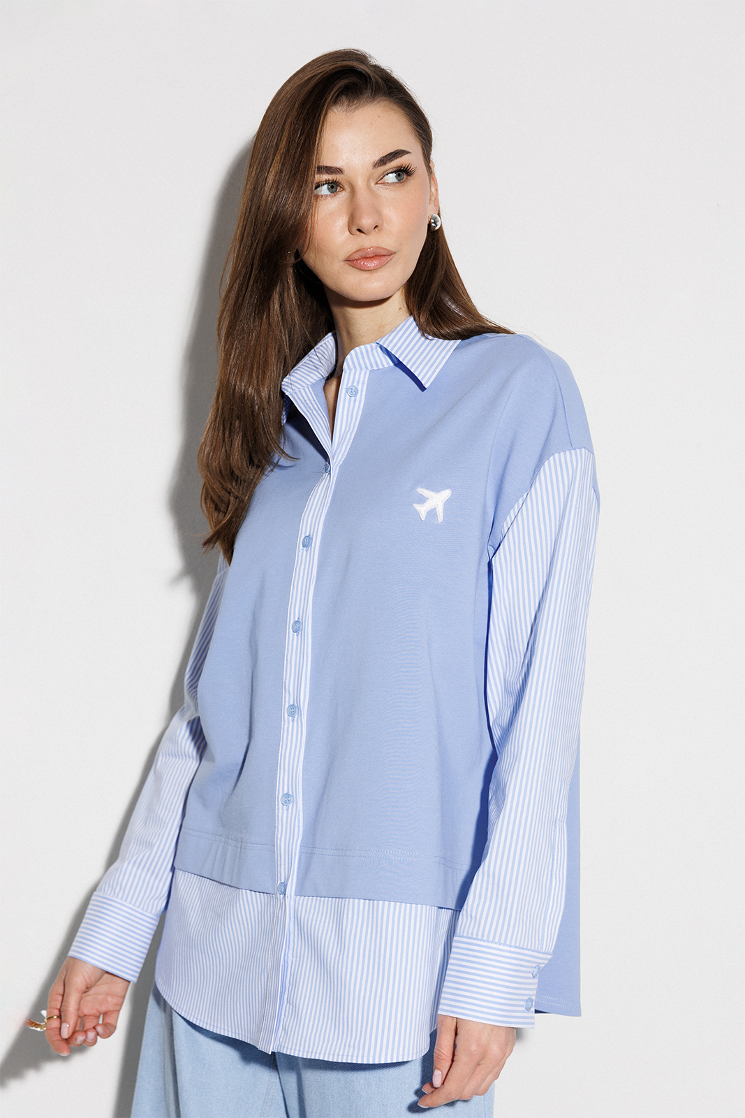 | Блузка, комбинированная прямого силуэта, с втачным одношовным рукавом, со складкой и манжетой, с застежкой на петли-пуговицы и спущенной линией плеча. Полочка из трикотажа и рубашечной ткани с центральной застежкой на петли-пуговицы и вышивкой «Самолет». Спинка из трикотажа с печатью «BUTER». Воротник рубашечный отложной на стойке. Спинка и полочка с фигурным низом. Внизу по боковым швам обработаны разрезы. |
