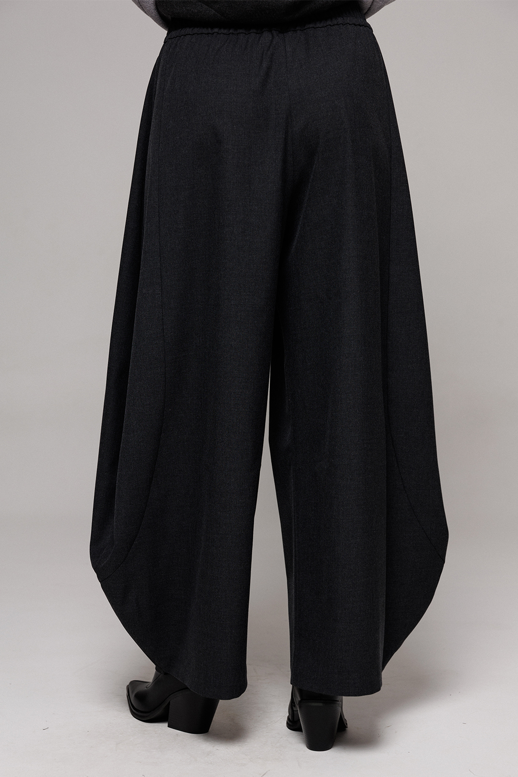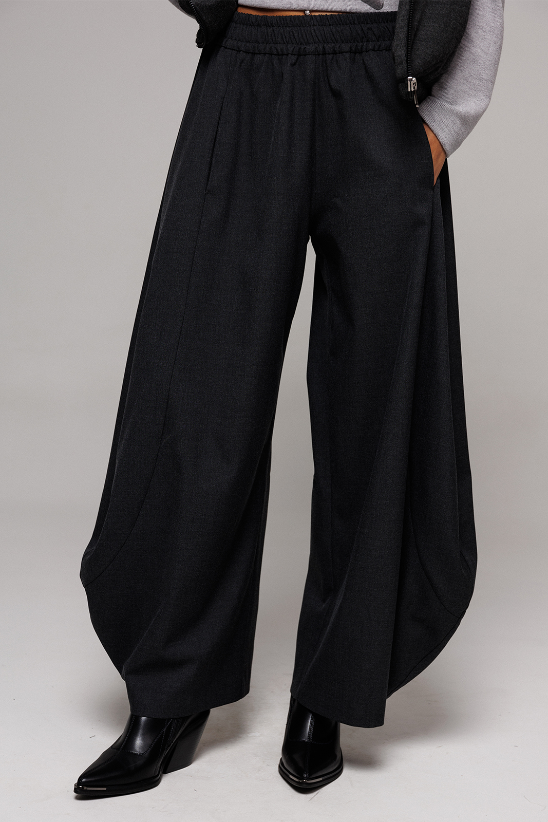 Брюки-шаровары из костюмной ткани свободного силуэта, зауженные к низу, на притачном отсроченном поясе со вставленной в него резинкой. Полочка с карманом в рельефе. По переду и спинке фигурные рельефы. |