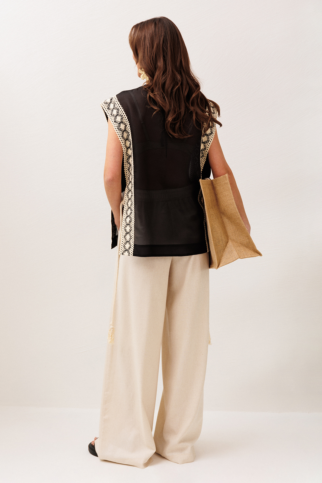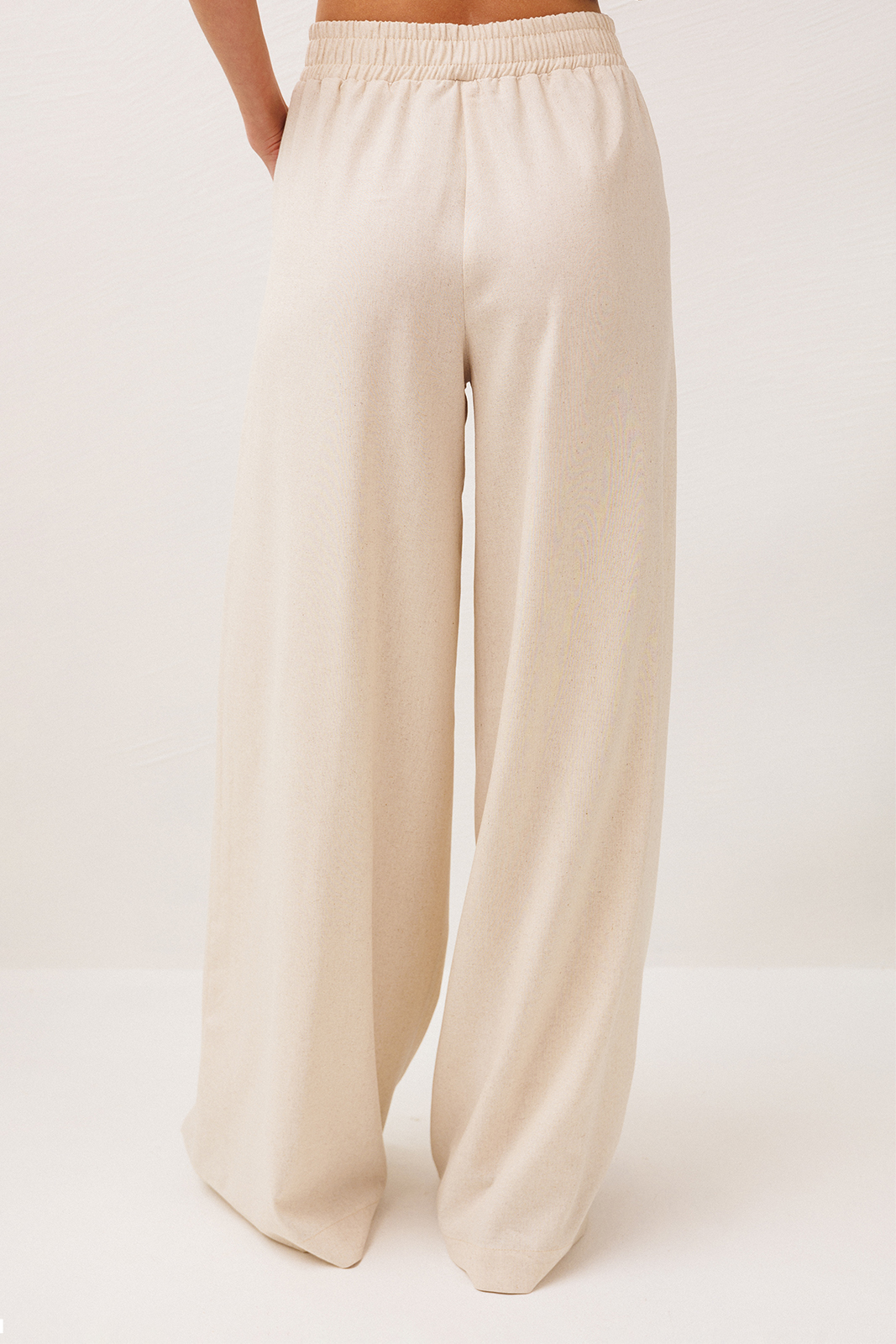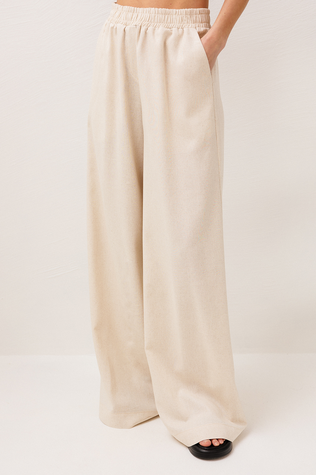 | Брюки немного расширенные к низу, на притачном, отстроченном поясе на резинке, с карманами в боковых швах. Вверху по переду имитация застежки-гульфик. |