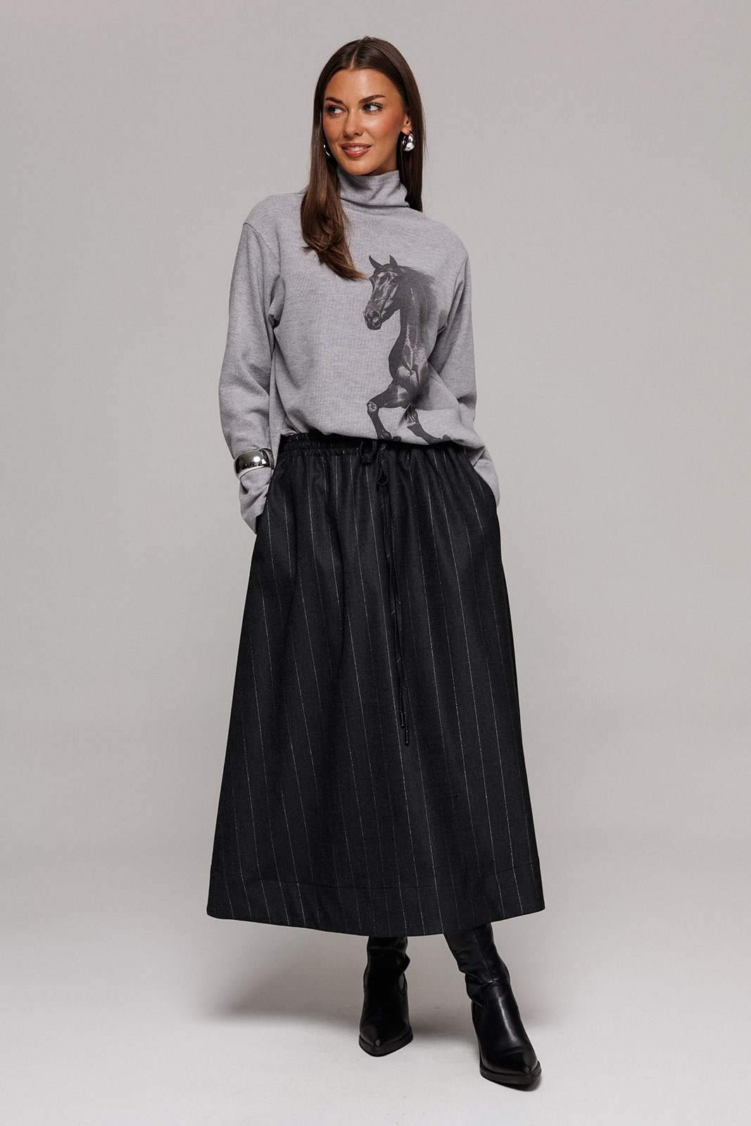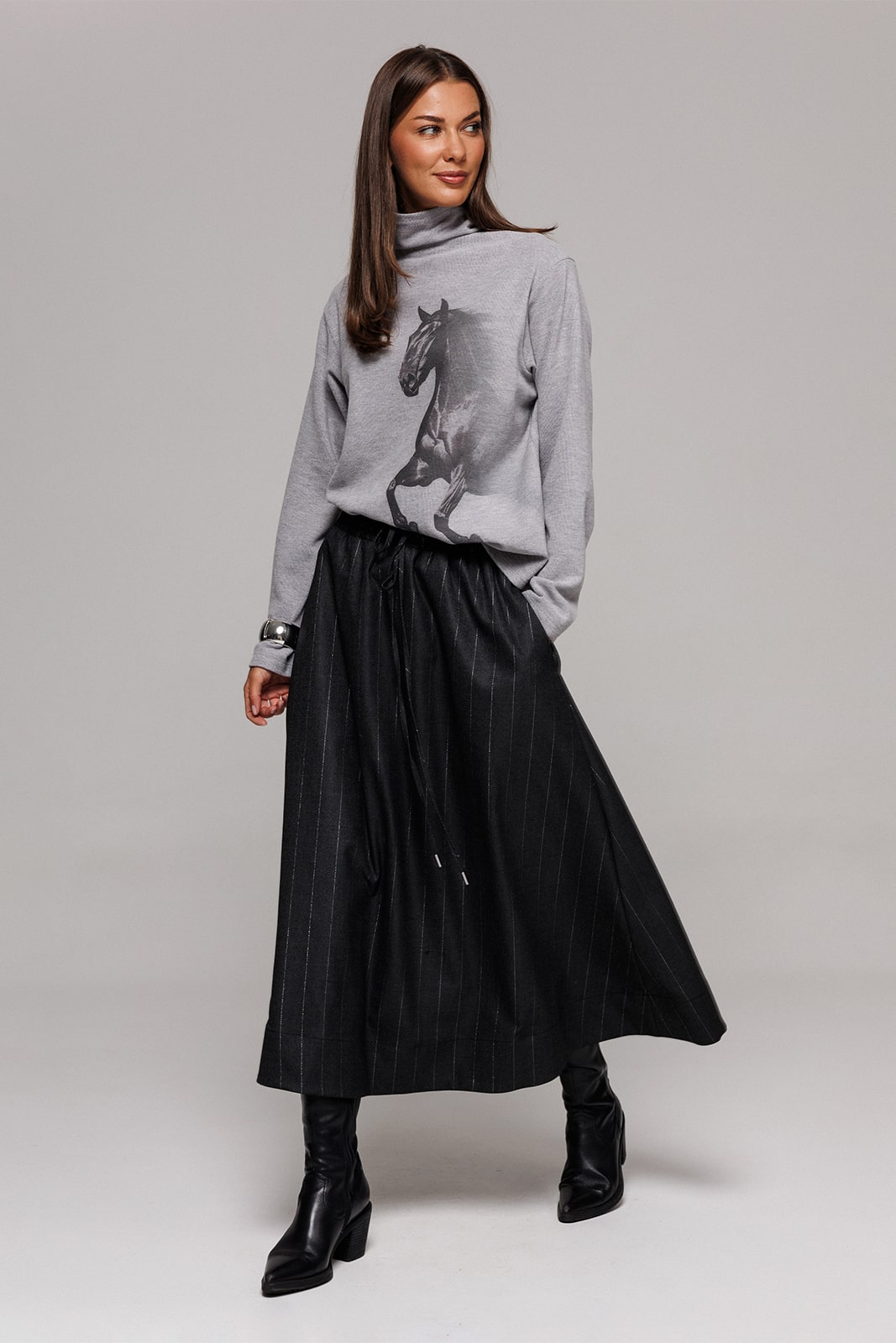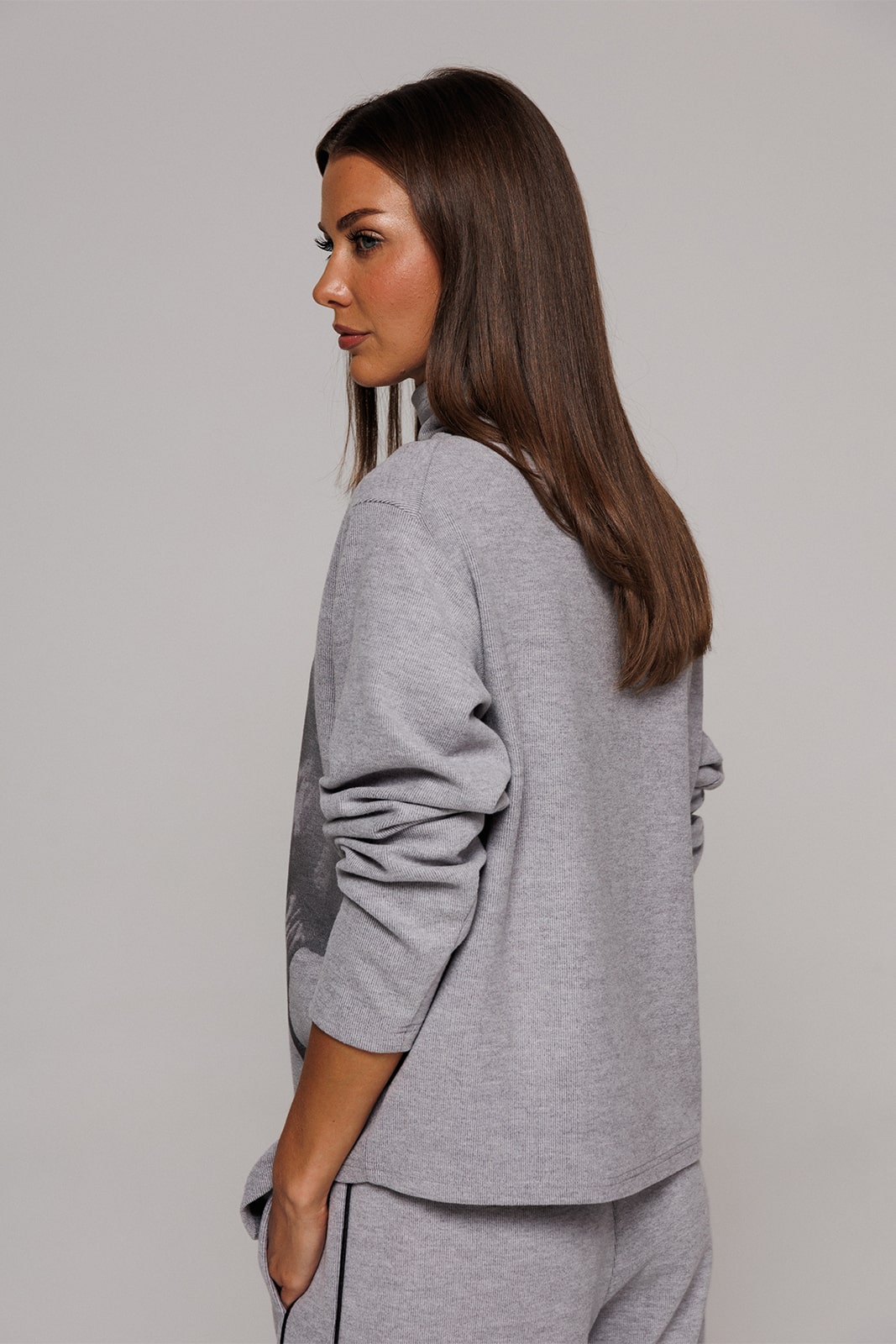 | Джемпер из трикотажного полотна с велюровым эффектом прямого силуэта со спущенной линией плеча. Рукав втачной. По переду печать «Лошадь» и нашивка с гравировкой «BUTER». Низ джемпера по переду фигурный ассиметричный. Внизу по правому боковому шву обработан разрез. Воротник-стойка цельнокроеный. Длина по ср.шву спинки(со стойкой): 42-46рр.- 76см., 48-52рр.-78см., 54р.- 79см. Длина рукава: 58см. |