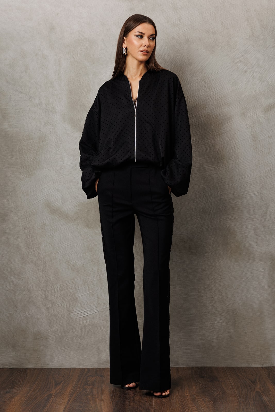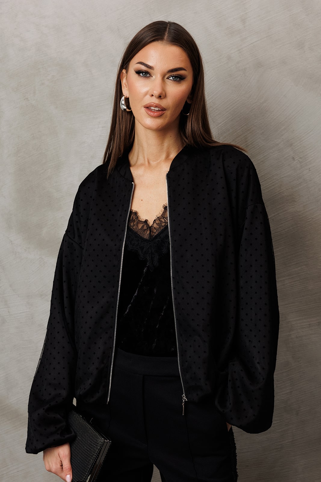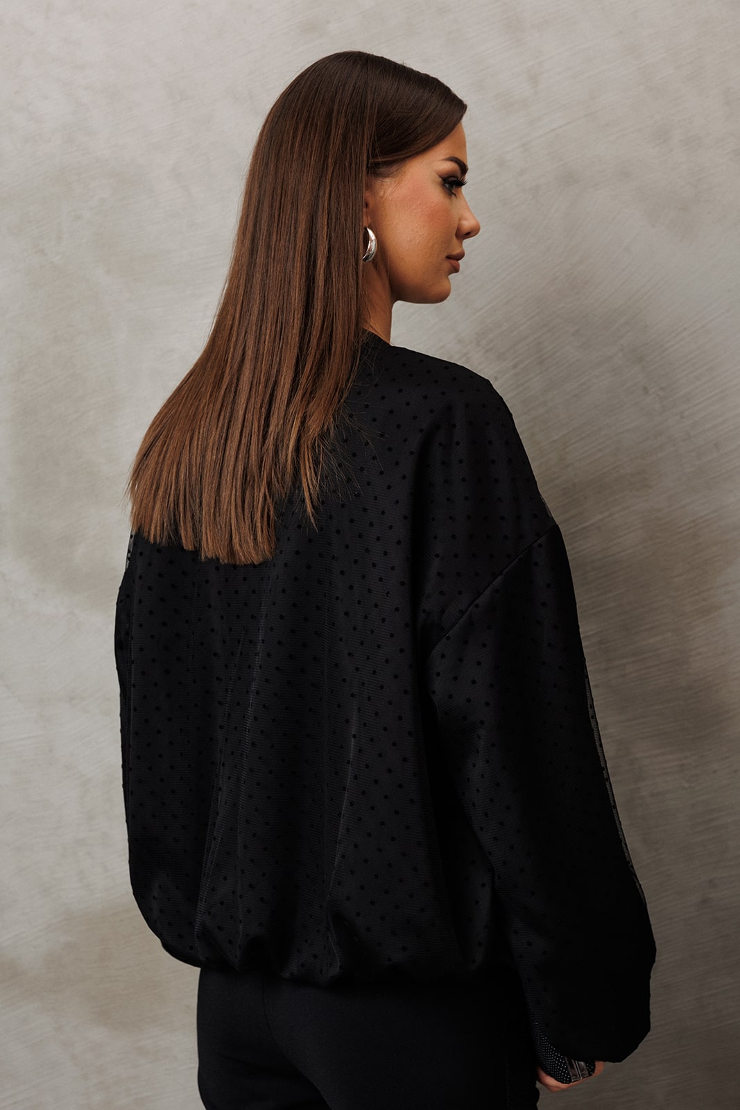 Жакет из атласа из фатина прямого силуэта со спущенной линией плеча. Рукав втачной одношовнный внизу на резинке. Полочка с центральной застежкой на тесьму-молнию. Полочка и спинка внизу на резинке. По горловине воротник-стойка. Жакет на подкладке.